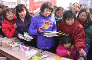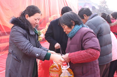 元月14日,由市妇联副主席储蕾带队组成的妇联关爱服务支队,顶着刺骨的寒风,在金坛薛埠镇开展“三下乡”活动,为当地农民送去了科技致富、法律维权和家庭教育等咨询服务,并现场免费赠送了反家庭暴力维权宣传手册、《家教读本》、《成功是与家教》、《节水小常识》、《青虾养殖》、《山药栽培技术》、《旅游农业》、《花卉栽培与保险技术》、《野菜栽培》等书籍1000余本和宣传年画1000余张,受到当地农民欢迎。在“三下乡”活动中,储蕾还代表市妇联向当地贫困家庭赠送了价值3000多元的棉被和食用油等慰问品。