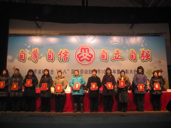 为隆重庆祝“三八”国际劳动妇女节100周年,进一步激发和调动全镇广大妇女投身“和谐罗溪”建设的积极性和创造性,3月5日下午,罗溪镇隆重召开了以“自尊、自信、自立、自强”为主题的庆祝“三八”国际劳动妇女节100周年暨表彰大会。来自罗溪镇各村、社区、机关企事业单位的800余名妇女欢聚一堂,满怀豪情地庆祝自己的节日。 (新北区妇联供稿) |