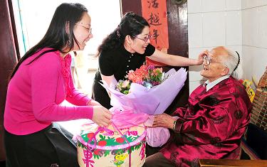 2010年母亲节到来之际,戚区丁堰街道妇联组织一批“爱心儿女”开展“情系五月,爱满人间”主题活动,她们与敬老院的孤老母亲、孤残妇女共度母亲节,让这些弱势妈妈共享天伦,深深感受到关爱和帮扶,爱心儿女们的每一个祝福换来了母亲幸福的微笑。儿女们表示这种爱将延续,每年都会去敬老院看望母亲,陪伴母亲,并呼吁更多的社会爱心儿女加入队伍。此外,这些爱心儿女还看望了两位百岁妈妈,给她们送去节日的问候。(戚区妇联供稿) |