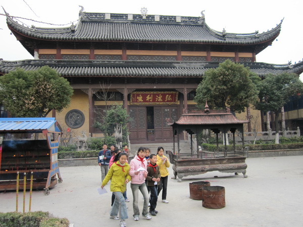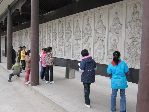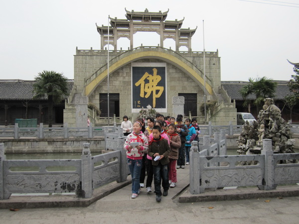 日前,春江镇圩塘小学组织部分学生来到万佛阁进行“龙城文化遗产寻访活动”。 在春江镇圩塘街北,有一座万佛禅寺,也称万佛阁。出校门走几分钟,过了奈何桥,映入眼帘的就是庄严的万佛阁。据说,此庙宇始建于宋仁宗年间,梵宇庄严,法务兴隆,成为延陵名刹,驰誉远近。自宋代以来,历经沧桑,遭受多次毁坏和修建,名称几易。现在已经重建,成为常州北端最大的宗教活动场所和旅游地。 寺庙门口,有一条“巨龙”张牙舞爪。刚进门,就看见一尊金色的佛像展现在学生们眼前,它高约10米,栩栩如生。四周有四大天王守护着。走到后面,一座W行桥引起了学生们的注意。其中最引人注目的,是那河里的大乌龟。有一只乌龟趴在石像上。河对面,天王殿飞檐凌空,每个角落上都有一个小铃铛,微风吹过,就会不由自主地摇晃起来,发出清脆的响声。桥旁边是钟楼,一口大钟吸引了我们,虽然外边加了围栏,但是这制止不了学生们的好奇心,都情不自禁地上去瞧了一眼。万佛阁里还有万佛楼、大悲楼、三圣宝殿、如意堂等殿宇,真是雄伟壮观。 “千支香,万支香,不如圩塘一支香;千拜万拜不如圩塘一拜”,这是流传在方圆几十里老百姓的一句口头禅。追其典故,在明朝洪武年间,明太祖朱元璋把这里封为“阴都”,也就是说人死后灵魂都要到这里来报到,所以万佛阁特建“因果城”,宣扬民间“善有善报,恶有恶报”的信念。 万佛禅寺,积淀着上千年的历史。通过“龙城文化遗产寻访活动”, 圩塘小学的孩子们开了眼界,了解认识了我市一些非物质文化遗产,进一步增强了孩子们对传统文化的保护和传承意识。