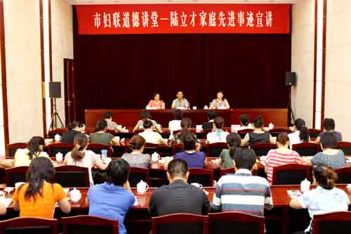 为发挥市妇联“道德讲堂”作用,以身边人讲身边事、身边人讲自己事、身边事教身边人,吸引干部群众投身道德实践活动,提升思想道德修养、社会文明程度和文明城市建设水平,8月7日,市妇联举办道德讲堂,邀请优秀爱民警官陆立才家庭作先进事迹宣讲。 陆立才同志是我市公安局监管支队拘留所主任科员。从警16年来,陆立才同志一直战斗在监管工作第一线,他在身患肝硬化多年的情况下,始终以一名共产党员的标准严格要求自己,以火一般工作激情勤奋耕耘、默默奉献,先后荣立个人二等功1次、三等功4次,多次被评为全国、全省公安监管系统深挖犯罪工作先进个人、常州市优秀爱民警官。他的平凡而感人的先进事迹经媒体报道后,在全社会引起强烈反响,得到各级领导充分肯定。陆立才的妻子朱雅萌是市妇联所属红溪实验幼儿园副园长。作为一个警察的妻子,她站在老陆身后默默支持丈夫工作,承担着家庭所有的重任;作为一名幼教工作者,她兢兢业业,任劳任怨,成为院长的好助手,老师的好姐姐,孩子们的好阿姨。2008年,她获得了市级机关优秀共产党员的称号。 陆立才夫妇家庭先进事迹的精彩宣讲赢得了台下阵阵掌声。机关干部在纷纷赞扬陆立才爱岗敬业、忠于职守的同时,赞美他们家庭的温馨和谐。他们说,从宣讲中我们可以感受到陆立才家庭是一个温馨美满的家庭,是一个互助共进的家庭,是一个和谐进取的家庭,可以说是我们妇联多年来开展的和谐文明家庭创建活动中涌现出的又一个榜样,值得我们大家学习。 道德讲堂开讲前,与会人员还观看了市公安局摄制的陆立才事迹宣传片《高墙里的一把火》。 市妇联机关全体人员、红溪实验幼儿园全体教师和市妇女儿童活动中心、市巾帼咨询服务发展中心全体党员干部参加了道德讲堂活动。