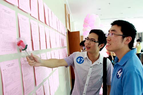 男青年在会场外的缘分墙上查看女青年的基本资料。
