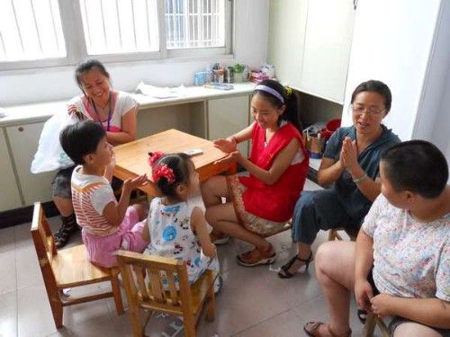 日前,由5名受助大学生组成的“感恩行动”志愿者服务小分队冒着高温来到溧阳市慧心康复中心,看望这里的智障儿童。与孩子们一起玩滑板游戏、辅导发音训练和手工制作等,真诚的交流与耐心的帮助赢得了孩子们的信任。图为志愿者和小朋友们一起做游戏(溧阳市妇联供稿) |