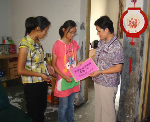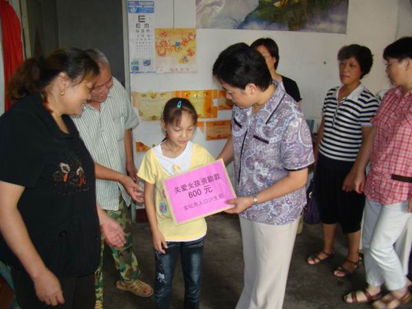 金坛市开展关爱女孩、帮困助学活动。日前,金坛市妇联、计划生育局、教育局等单位对全市范围内贫困家庭开展慰问活动,给金城镇、开发区的三户计划生育女孩户送去了慰问金,表达了党和政府对贫困群众的关注和关怀。