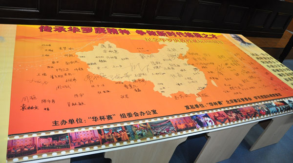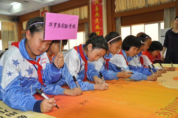 今年是华罗庚教授诞辰100周年,也是“华杯赛”举办25周年。为了纪念这位世界著名数学家,学习他一生热爱祖国,献身科学事业的奋斗精神和高尚品质,让华罗庚教授宝贵的精神遗产得以传承,并进一步发扬光大。金坛市教育局、妇联、团市委等联合举办以“传承华罗庚精神,争做时代栋梁之才”为主题,以“学习•进步•创新”为内容的“传承华罗庚精神签名活动”。