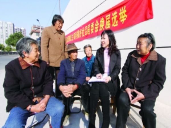 图为薛凤英(右二)征求居民对社区居委会换届选举工作意见 |