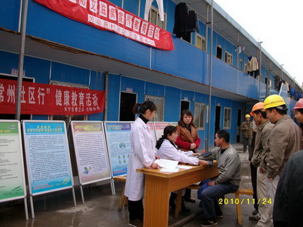 为维护和促进流动人口身心健康,天宁区九洲新世界社区、天安河滨社区、社区卫生服务站、计生协、妇联共同走进宏大公司工地生活区,把温暖和健康送到流动人口当中。食用合格碘盐、预防碘缺乏病……12块展板上写着各类卫生健康知识,社区卫生服务站的高医生给120多位民工测量了血压并给他们讲解了预防高血压的常识。通过一系列活动,普及健康素养和卫生防病等科普知识,提高广大流动人口的防病知识知晓率和健康行为形成率,引导流动人口自觉养成科学、文明、健康的生活方式。整个关爱健康活动深受农民工朋友们的欢迎,大家一致表示希望以后经常能有这样的活动,以提高他们的健康常识,从而引导他们养成健康、科学的生活习惯。(天宁区妇联供稿)