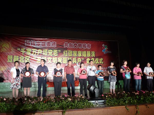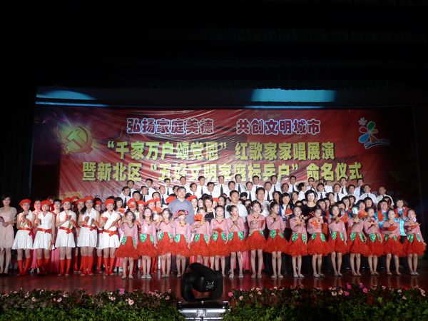 6月17日,常州市新北区妇联举行“弘扬家庭美德,共创文明城市”——“千家万户颂党恩”红歌家家唱展演暨新北区“五好文明家庭标兵户”命名仪式。 红歌家家唱展演在新桥中学热闹欢庆的歌舞《在希望的田野上》开场。紧接着,新桥中心幼儿园的家庭绘本剧《12只老鼠去郊游》、春江镇大学生村官的配乐诗朗诵《没有共产党就没有新中国》、三井中心幼儿园的快板《开放的新北在腾飞》、泰山小学的表演唱《绣红旗》、三井街道在大合唱《共和国之恋》等10多个节目精彩纷呈。当春江镇女企业家协会的红歌联唱《太阳最红毛主席最亲》等5首红歌唱响时,观众和声四起,主持人趁势和观众互动对歌,欢声笑语把晚会推向了高潮。最后,全场起立,国旗舞动,一起唱响了《没有共产党就没有新中国》,现场顿时一片红歌的海洋,群情沸腾,意气奋发,为祖国的繁荣昌盛、为常州的文明和谐而歌唱。 区委常委、组织部长陈建新,区委常委、宣统部部长杨光,区妇联主席沈春英、区总工会副主席胡九宏、团区委书记万丽萍等领导和观众朋友一同观看演出,为获得表彰的20户新北区“五好文明家庭标兵户”颁奖,为创建文明城市加油喝彩。