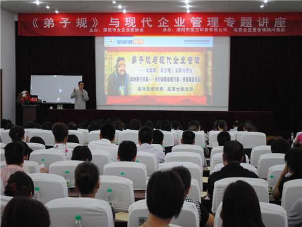 为进一步提升溧阳市女企业家的经营管理水平和综合素质,努力造就一支善于经营管理的高素质女企业家队伍,近期,溧阳市女企业家协会特邀请了北京金蓝盟管理顾问集团高级培训师刘长城老师来我市作“《弟子规》与现代企业管理”专题讲座,此次讲座吸引了全市300多名女企业家及企业中高层管理人员来参加。溧阳市女企业家协会名誉会长、市妇联主席张雅萍、副主席胡雪芹、女企业家协会会长黄梅芳参加了本次活动。 在培训中,刘老师以《弟子规》中的“入则孝”为切入点,与300多名企业管理人员探讨了做人的根本——那就是要孝顺长辈。此外。刘老师还将《弟子规》中如何做人做事、友爱兄弟、立身处世、待人接物、修身治学与现代企业管理有机结合起来,并辅以许多生动的案例互动,让在座人员感受到了传统文化与企业管理融合的魅力。现场气氛十分热烈,掌声笑声不断。(溧阳市妇联供稿) |