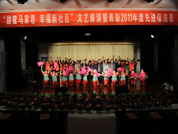 近日,“甜蜜马家巷 幸福新社区”文艺展演暨2011年先进保洁员表彰大会在马家巷社区会议室举行,舞蹈、合唱、小品、相声、锡剧...节目形式多样、精彩纷呈,得到了马家巷社区三百多位居民的阵阵喝彩。其中小品《特殊美容师》是根据马家巷的“社区美容师”的真实故事编写的,他们用满身尘土,换来马家巷社区的干净整洁,他们用不怕脏不怕累的奉献精神谱写了劳动者的光荣歌颂,小品走进他们生活的酸甜苦辣,讲述他们的真实故事,得到了在场观众的一致好评。活动中,马家巷社区妇代会主任潘芬为评选出的三名“2011年度先进保洁员”进行了现场表彰奖励,感谢他们一年以来为马家巷社区干净整洁的环境付出的辛勤劳动,希望他们在新的一年里能够一如既往认真工作。(武进区妇联供稿)