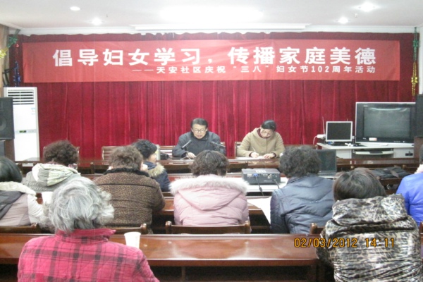 在第102个“三八”妇女节来临之际,为丰富辖区妇女同胞的精神文化生活,3月2日上午,天安社区组织开展了“倡导妇女学习传播家庭美德”庆祝“三八”妇女节102周年宣讲活动。 本次宣讲活动由社区宣讲员蒋浩金老师主讲,为辖区妇女同胞带来了“家庭美德”的生动一课。以“新北区美德家庭”典范盛娴老师一家人的先进事迹为案例,蒋浩金老师深情阐述了“尊老爱幼、男女平等、夫妻和睦、勤俭持家、邻里团结”的家庭美德内涵,倡导辖区妇女同胞以先进典型为榜样,以幸福家庭为导向,从自身做起、从小事做起、从现在做起,构筑诚信友爱、平等互助的人际环境,营造安居乐业、温馨和谐的家庭环境,弘扬家庭美德,倡扬文明新风。 (新北区妇联供稿)
