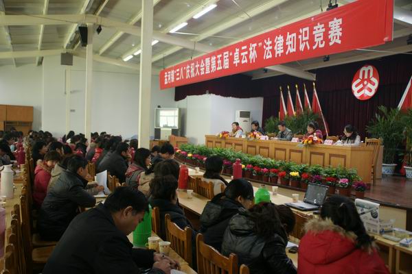 3月6日下午,孟河镇“三八”庆祝大会暨第五届“卓云杯”法律知识竞赛在镇政府三楼会议室隆重举行。庆祝大会由镇妇联主席作工作报告,党委副书记杨波作重要讲话。会后进行的是以“学法知法争当合格公民,懂法守法共创和谐孟河”为主题的孟河镇第五届“卓云杯”法律知识竞赛。竞赛内容以《宪法》为主,包括《妇女权益保障法》、《婚姻法》、《工会法》、《劳动法》、《未成年人保护法》、计划生育知识及建设社会主义新农村等有关内容。共有55支队伍165名选手参加此次竞赛。竞赛分笔试和口试两个阶段举行,期间,组委会还安排了观众互动以及唱歌节目等助兴。经过紧张激烈的比赛,最后由常州市卓云精细化工有限公司选派的参赛队获得了一等奖。 (新北区妇联供稿)