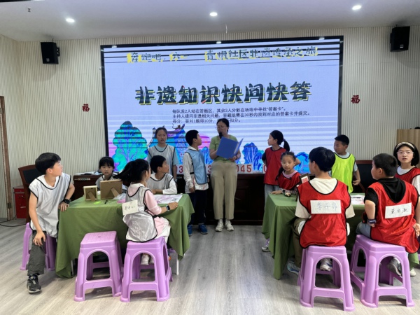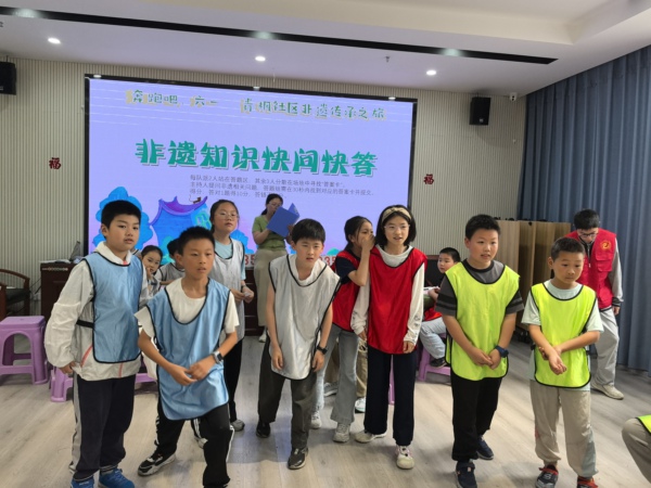活动伊始,青少年们随机抽签后分为四队,经过相互认识后,设计了自己的队名、口号并进行了展示。破冰游戏“非遗密码传递”拉近了青少年之间的距离,点燃了孩子们的探索热情。随后,主持人一声令下正式开启了“奔跑吧,六一——非遗传承之旅”。 第一关“非遗传承大作战”中,孩子们秒变“文化小工匠”。在“珍珠龙舟绘”环节,大家分组接力,用彩色珍珠在宋锦画布上拼贴端午龙舟竞渡图,一颗颗珍珠错落排列,勾勒出浪花翻涌、龙舟飞驰的生动画面;“汉绣粽香拼图”则将端午粽子纹样拆解成碎片,孩子们穿梭场地寻找线索,拼凑过程中惊叹于汉绣针法的细腻精妙。“原来汉绣的丝线能绣出这么逼真的粽叶!”完成拼图的小朋友兴奋地分享发现。 第二关“非遗智慧接力赛”则掀起脑力风暴。“扎染起源于哪个省份?”“汉绣的四大特色颜色是什么?”“扎染的古称是什么?”等问题接连抛出,小选手们争分夺秒寻找答案卡并提交;非遗工艺拼图接力时,扎染流程图中暗藏“端午扎染五色丝线驱邪”的小知识,孩子们围聚讨论扎染步骤、泥塑流程,拼图背面暗藏的任务线索更激发探索热情。