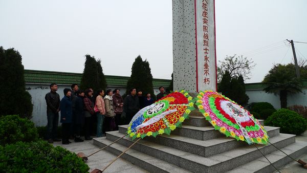 近日,孟河镇妇联带领本镇女大学生村干部,来到孟河镇郑良村天花庄的烈士陵园,祭奠在天花庄突围战中英勇牺牲的烈士们.大学生村干部们神情肃穆,庄严鞠躬,并被烈士们不畏艰险,勇于杀敌的精神深深感动,纷纷表示要向先烈学习,吃苦耐劳,为本镇的现代化建设贡献力量。