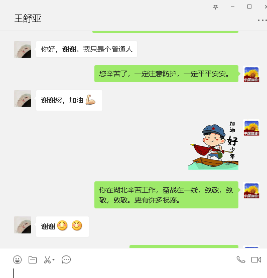 非常时期,为国家、为武汉贡献自己力量是光荣的,虽然逆行武汉比较危险,但是相信你的专业素质,一定能平安归来,家里还有两个孩子等妈妈。爸妈家里有哥在,你放心去工作,为武汉战胜疫情努力!——王舒亚的哥哥