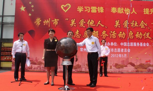 5月12日,常州市在钟楼广场举行学习雷锋好榜样“关爱他人、关爱社会、关爱自然”志愿服务活动启动仪式,中央文明办志愿者工作组副组长崔海教,常州市委常委、宣传部长徐缨出席启动仪式并讲话。30多名巾帼志愿者积极加入,主动参与“三关爱”志愿服务活动。 徐缨在讲话中提出,常州市上下要以此次“三关爱”启动仪式为契机,按照中央文明办的部署和要求,广泛普及“弘扬雷锋精神,奉献他人,提升自己”的志愿服务理念。要把关爱他人作为进一步提升文明幸福常州的有效载体,在全社会形成团结互助、平等友爱、共同进步的社会氛围和人际关系,增加和谐因素、体现幸福生活;要把关爱社会作为进一步提升和谐平安常州的有效载体,以“迎接十八大、讲文明、树新风”为主题,广泛开展志愿服务活动,为政府分忧、为百姓解难,促进公平正义、维护社会稳定;要把关爱自然作为进一步提升园林生态常州的有效载体,通过扎实有效的志愿服务活动,全面提升城市文明程度和市民文明素质。 围绕“三关爱”活动,常州市巾帼志愿者将以“心系百姓,情暖万家”志愿服务月月行活动为龙头,积极开展生活照料、亲情陪护、医疗卫生等志愿服务;以“家庭美德讲堂”为主要传播平台,发动广大市民参与文明家庭创建;将“绿色生活、低碳出行”、“美丽的常州我的家”等环保志愿服务行动为抓手,倡导节约能源、保护环境,切实把“三关爱”落到实处。