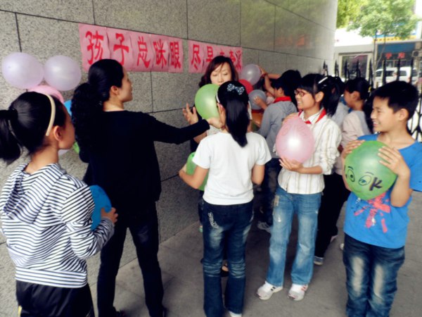 为了让小学生更好的感受眼睛健康的重要性,5月29日戚区戚大街社区妇联在戚墅堰实验小学门口开展了“关注青少年眼健康”宣传。社区妇联利用小学生喜欢气球这个切入点,发动巾帼志愿者在气球上创作了动漫爱眼图画,让他们了解爱护眼睛应跟气球一样要小心,一旦受损后很难恢复。活动取得了很好的效果。(戚区妇联供稿) |