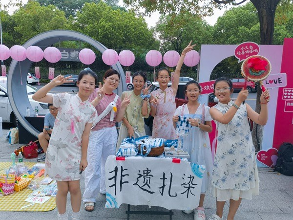 在活动现场还设置传统习俗体验区投壶、乞巧等游戏活动环节,通过游戏参与民俗活动体验文化生活增强对民族文化的认同感和归属感。在一旁的七夕风俗游戏体验区更加的热闹,有猜灯谜、手印DIY、流体熊制作、告白留言板等活动环节。在非遗展示专区,则邀请非遗传承人将剪纸、虎头鞋、漆扇手绘等非遗制作技艺结合七夕节文化现场进行创作及技艺展示,居民可近距离欣赏到非遗传承人现场展示,让更多社区居民了解非遗、喜爱非遗、参与非遗、保护非遗,营造了良好的宣传展示氛围。